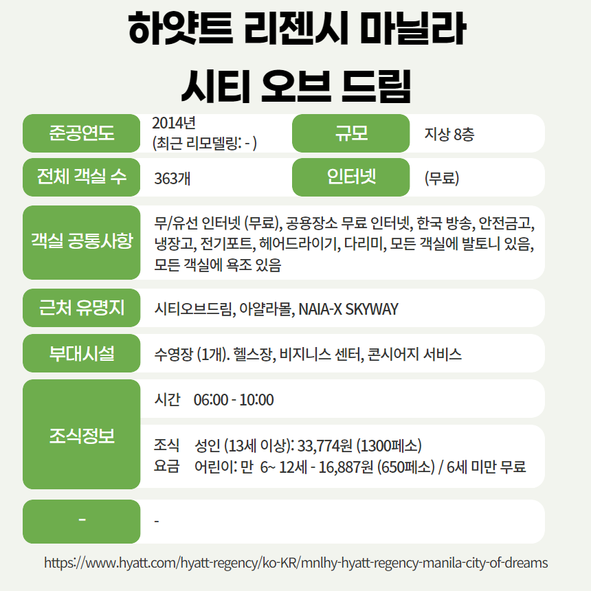 하얏트 시티 오브 드림 호텔은 2014년 오픈한 호텔로 총 8층 363개의 객실을 보유한 5성급 호텔 입니다.