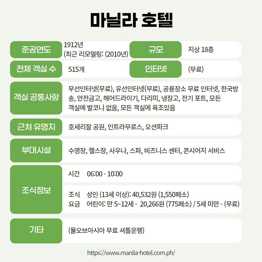 가장 필리핀 다운 호텔의 모습을 가지고 있고 마닐라베이 옆에 위치해 있습니다. 이 호텔은 필리핀을 방문하는 각 국의 국빈들이 이용하는 호텔이며 1912년부터 지금까지 100여 년의 역사를 자랑하는 필리핀의 대표 호텔입니다.