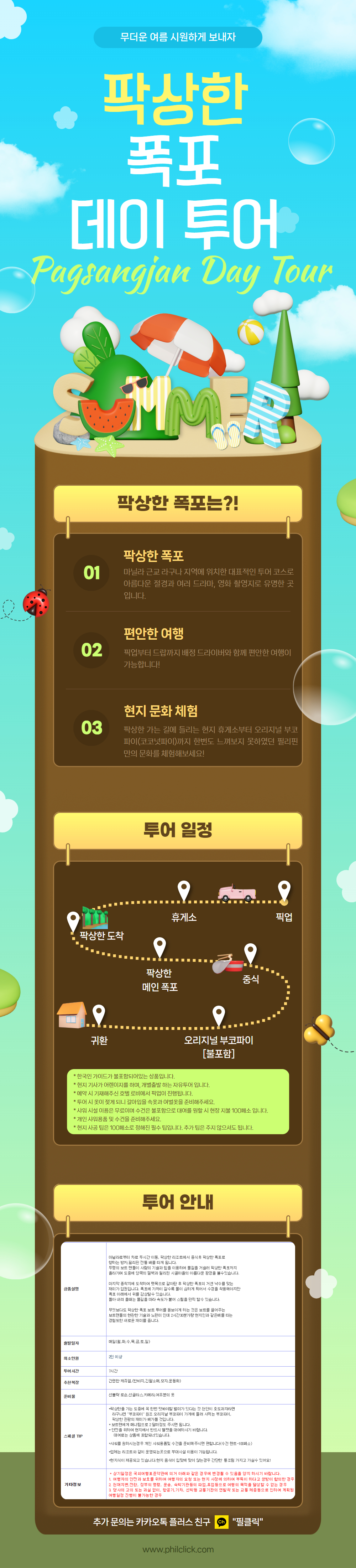 두 명의 보트맨이 필리핀전통 방카를 오직 사람의 기술과 힘을 이용해 급류를 거슬러 올라 팍상한 폭포가까지 이동하는 코스로 가는도중 양쪽의 절벽과 시골마을의 아름다운 풍경까지 감상하실수 있습니다.