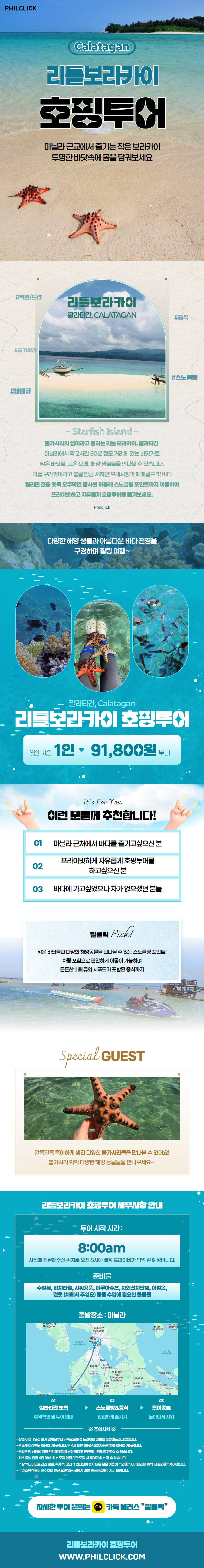 리틀 보라카이, 깔라따간에서 만나는 에메랄드빛 낙원! 눈부신 백사장, 투명한 바다, 그리고 끝없는 하늘. 마닐라에서 출발~ 필리핀의 숨겨진 보석 깔라따간 호핑투어로 떠나보세요! ✔️ 보라카이를 닮은 새하얀 모래섬 ✔️ 스노클링으로 만나는 형형색색 산호초 ✔️ 한적한 바다에서 즐기는 감성 가득 힐링 숨겨진 파라다이스, 지금 떠나보세요! 🌊⛵