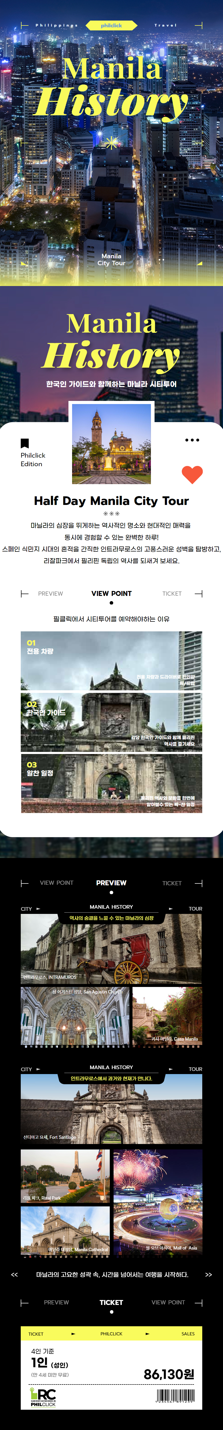 마닐라 도심지에 있는 역사 투어코스로, 국민 영웅 호세 리잘을 기념하기 위한 공원과 스페인 식민지 시절 성곽 지인 인트라무로스 내 대성당, 박물관 및 스페인 건축 양식들까지 놓치기 쉬운 코스까지 한국인 가이드의 설명과 함께하는 조인투어 입니다. 전문 가이드의 자세한 설명과 더불어 필리핀의 역사를 체험하고 배우는 특별한 시간이 될 것입니다. 마닐라 최초로 최고급 럭셔리 대형벤으로 운영되는 조인 워킹투어 입니다.