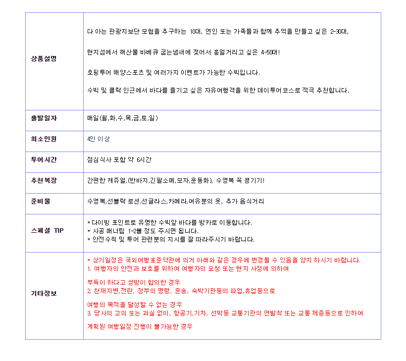 다 아는 관광지보단 모험을 추구하는 10대, 연인 또는 가족들과 함께 추억을 만들고 싶은 2-30대, 현지섬에서 해산물 바베큐 굽는냄새에 젖어서 흥얼거리고 싶은 4-50대! 호핑투어 해양스포츠 및 여러가지 이벤트가 가능한 수빅입니다. 수빅 및 클락 인근에서 바다를 즐기고 싶은 자유여행객을 위한 데이투어코스로 적극 추천합니다.