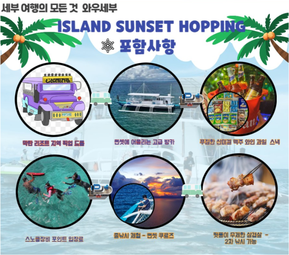 세부에서 유일하게 썬셋 호핑투어를 즐길수 있습니다. 오후 3시 시작되는 투어로 막탄내 리조트 무료픽업 포함이며 항구도착후 전용 보트를 타고 스노클링 포인트로 이동합니다.이동하며 제공하는 무료 맥주및 음료,(각 2병씩 제공) 스낵을 드실수 있습니다. 포인트 이동후 스노클링 시간, 낚시 포인트로 이동후 줄낚시 체험및 포함된 와인을(각1잔) 즐기며 세부의 아름다운 석양을 감상합니다. 석양 감상후 식당으로 이동하여 무제한 삼겹살까지 즐길수 있는 투어입니다. *여행 일정 마지막날 귀국 팩케지를 이용하신다면 체크아웃후 호핑> 석식>스톤 마사지>공항 샌딩까지 원스톱 서비스를 받을수 있어요!