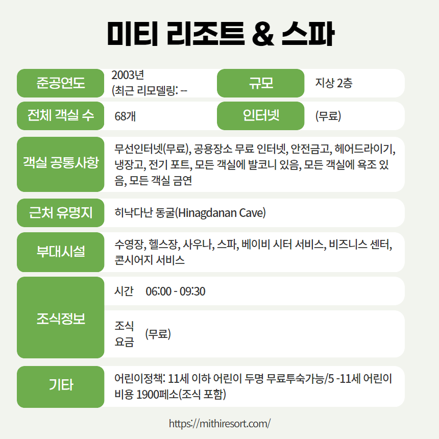** 리조트 픽업: 차량 650페소 / 밴 800페소