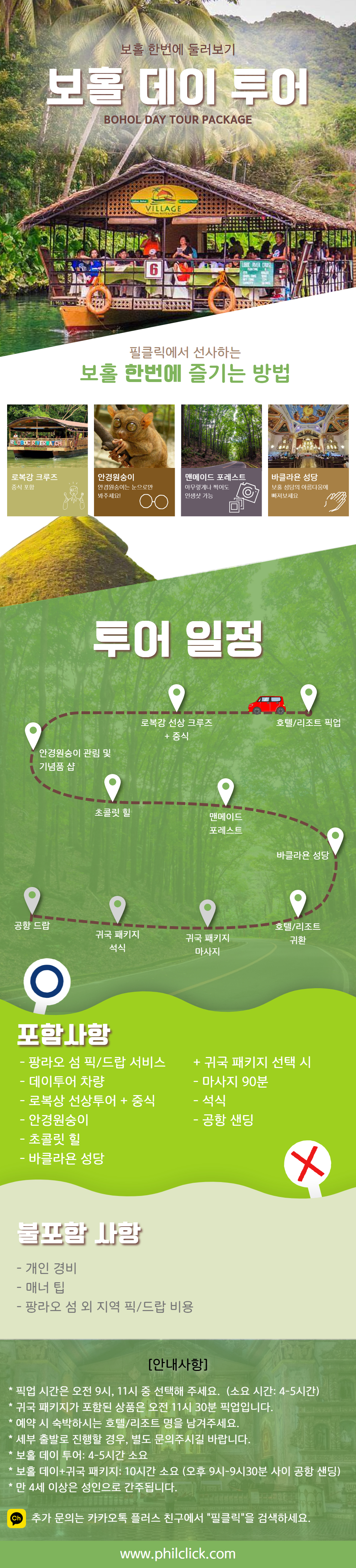 ▶ 본 투어는 보홀에서 출발하는 단독 투어로 보홀,팡라오 리조트에서 출발하여, 현지인기사가 안내하는 개별출발 단독투어입니다. ▶ 보홀 항구픽업 요청시 편도 1000페소가 추가 발생하오니 예약시 남겨주세요! ▶ 단독 상품으로 시간 제한없이 여유롭게 즐겨보세요. ▶ 짚라인등의 추가 액티비티를 원하시면 드라이버에 전달해주세요. 무료로 모셔다 드리며 짚라인 비용은 직접 지불 하시면됩니다. ▶ 보홀데이 귀국 팩케지를 이용하시면 마사지+석식+공항 샌딩까지 편하게 귀국 하실수 있어요.