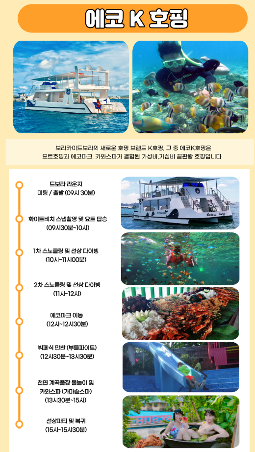 럭셔리한 요트를 타고 아름다운 보라카이 주변 해변투어와 함께 스노클링, 선상다이빙을 즐기고 필리핀 뷔페식 만찬인 부들파이트 - 다양한 씨푸드, BBQ, 열대과일 디저트까지 즐긴후 에코파크의 천연계곡풀장과 카와스파를 즐기는 알찬 코스