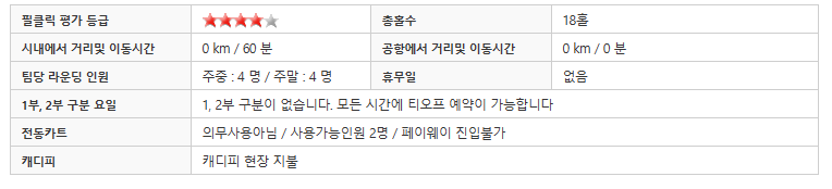 ▣아래의 요금은 예고없이 변동될 수 있으며, 이미 확정된 예약인 경우 변경된 요금에 영향을 받지 않습니다. 즉, 요금이 인상 또는 인하 되더라도 이미 입금되고 바우처가 발송된 경우에는 이에 따른 추가 지불 또는 환불이 없습니다. ▣기재된 금액에는 모두 부가세 및 서비스 차지가 포함되어 있습니다. ▣골프장의 판단으로 플레이가 중단되지 않는 이상, 우천 등의 기상상황, 개인 사정(지각, 웨이팅) 등 어떠한 경우에도 취소, 환불되지 않습니다. ▣일반적으로 카트 이용은 티오프 당일 선착순으로 사전 예약 및 이용이 보장되지 않습니다. ▣골프장 이용 시 발생하는 분실 및 파손물에 대해서는 필클릭에서는 책임지지 않습니다. 라운딩 시 소지품을 꼭 주의하여 주시기 바랍니다. ▣해당 바우쳐는 휴대폰 사진 등으로 제시하셔도 됩니다. 바우처를 체크인 시 제시하지 않을 경우 현장에서 그린피(정가)를 재 지불해 주셔야 합니다. ▣라운드티, 축구 유니폼, 보드셔츠, 청바지계열, 짧은반바지는 입장이 불가능합니다. 한국에서 골프웨어로 나온 차이나 카라티 입장 불가능한 곳이있으므로 되도록 일반 피케티(카라티)를 착용하시는게 좋습니다. 무릎 길이의 반바지는 허용 되고 있습니다. ▣일반적으로 1인 1캐디 정책이지만 경우에 따라 1인 1캐디 플레이가 불가능한 경우도 있습니다. ▣이는 골프장 사정에 따라 달라지는 것으로 이 경우에도 캐디피 & 캐디팁은 동일하게 지불하시게 됩니다. ▣외부의 음료 및 음식물은 필드로 반입이 불가능합니다. 적발시 번거로운 일이 발생할 수 있으니 반입을 자제해주세요.