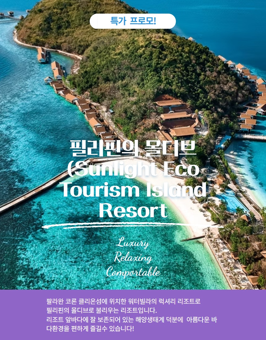 썬라이트 리조트는 총면적 18헥타르 정도이며 ,섬 전체를 리조트 부대시설과 객실,해양 환경이 훌륭한 바다와 다양한 해양 액티브티를 제공합니다.