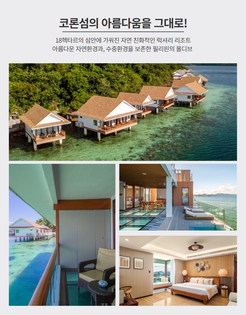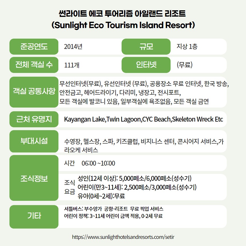 팔라완 코론의 쿨리온섬에 위치한 썬라이트 에코 투어리즘 리조트는 부수앙가 공항에서 1시간 40분이동해야 합니다.