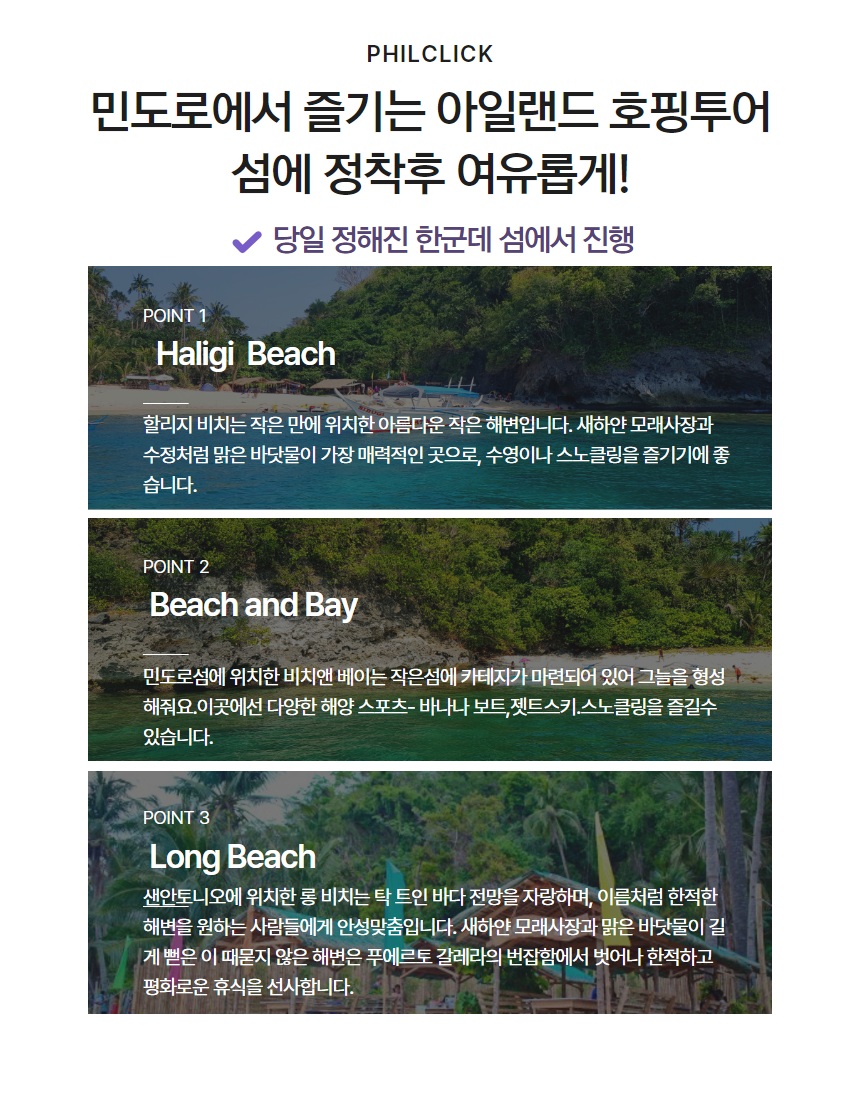 1️⃣ 민도로는 마닐라에서 차량으로 바탕가스 이동후 보트를 타고 이동해요. 2️⃣ 국내선을 갈아 타지 않아도 마닐라에서도 아름다운 화이트 샌즈 해변과 산호& 열대어감상이 가능한 스노클링 포인트 많은 섬입니다. 3️⃣ 사방비치에서의 나이트문화는 오래전 보라카이와 같이 때묻지 않은 현지 분위기를 즐길수 있어요! 민도로 섬에서 즐기는 스노클링은 아래와같이 3군데의 포인트중 당일 기상 상황에 따라 한군데에서 진행하게 되요 ‼️Haligi Beach 할리지 비치는 작은 만에 위치한 아름다운 작은 해변입니다. 새하얀 모래사장과 수정처럼 맑은 바닷물이 가장 매력적인 곳으로, 수영이나 스노클링을 즐기기에 좋습니다. ‼️Beach and Bay 민도로섬에 위치한 비치앤 베이는 작은섬에 카테지가 마련되어 있어 그늘을 형성해줘요 이곳에선 다양한 해양 스포츠- 바나나 보트,젯트스키.스노클링을 즐길수 있습니다. ‼️Long Beach 샌안토니오에 위치한 롱 비치는 탁 트인 바다 전망을 자랑하며, 이름처럼 한적한 해변을 원하는 사람들에게 안성맞춤입니다. 새하얀 모래사장과 맑은 바닷물이 길게 뻗은 이 때묻지 않은 해변은 푸에르토 갈레라의 번잡함에서 벗어나 한적하고 평화로운 휴식을 선사합니다. 📢 민도로 아일랜드 호핑투어는 위 3가지 섬중 한군데에서 진행해요. 📢섬 투어를 추가 하고 싶으면 예약시 섬추가로 추가 하실수 있어요. 📢포함된 식사는 BBQ입니다. 씨푸드를 원하는경우 예약시 추가 할수 있어요. ✅오전 10시 출발 오후 4시 종료 합니다.