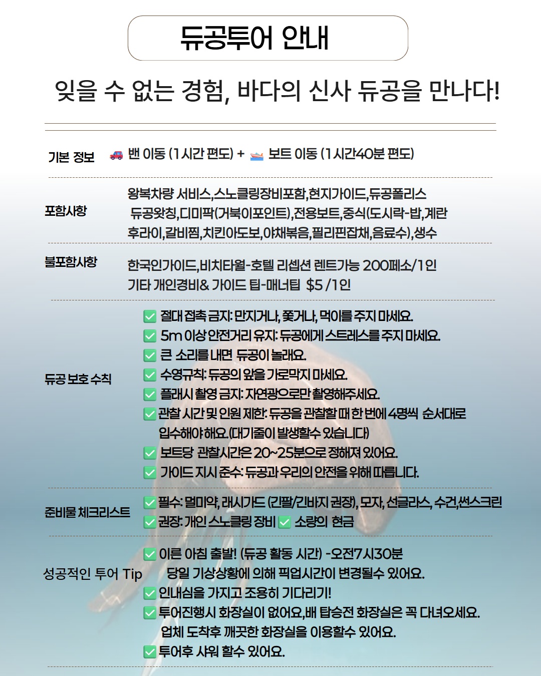 ✔ 환경 보호 수칙 준수: 듀공 투어는 엄격한 환경 보호 규정을 따릅니다. 듀공을 만지거나, 쫓아가거나, 먹이를 주는 행위는 절대 금지됩니다.