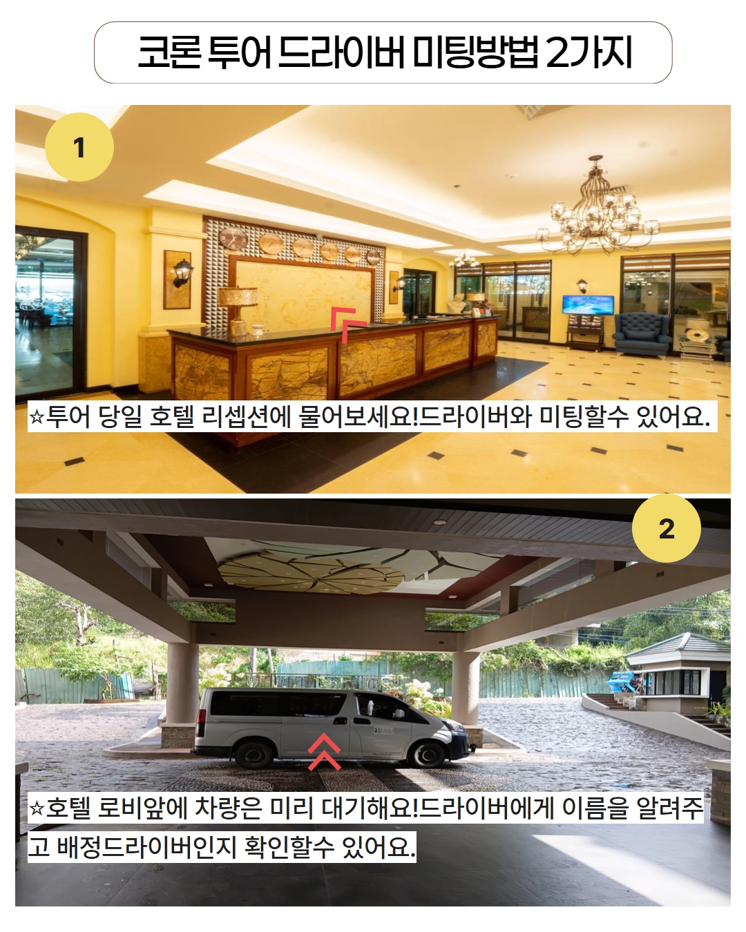 ✅긴 이동 시간: 코론 타운에서 투어 출발지까지는 차량이동 1시간 30분, 보트이동 40분등 상당한 시간이 소요될 수 있습니다.